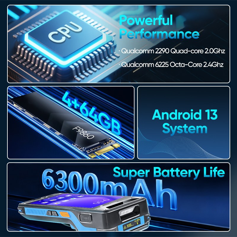 The F9860 is a versatile smart handheld terminal and barcode printer featuring multiple scanning heads, including optional UHF and ID card (with hardware decoding), paired with a high-capacity 6800mAh battery for 512-hour extended usage. Designed for seamless scanning and printing tasks in diverse environments, it delivers unmatched efficiency and durability.