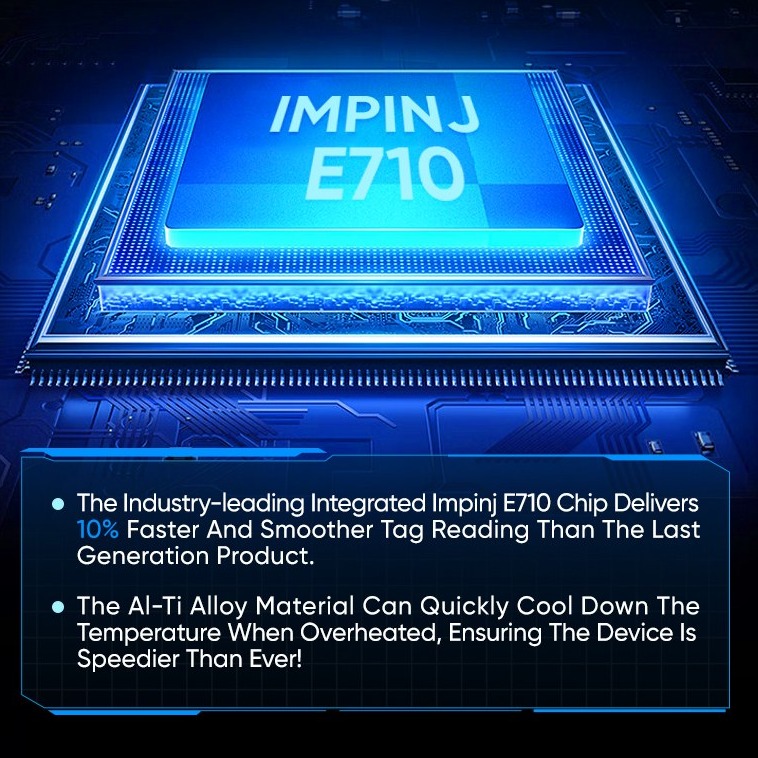 - The industry-leading integrated Impinj E710 chip delivers 10% faster and smoother tag reading than the last generation product.