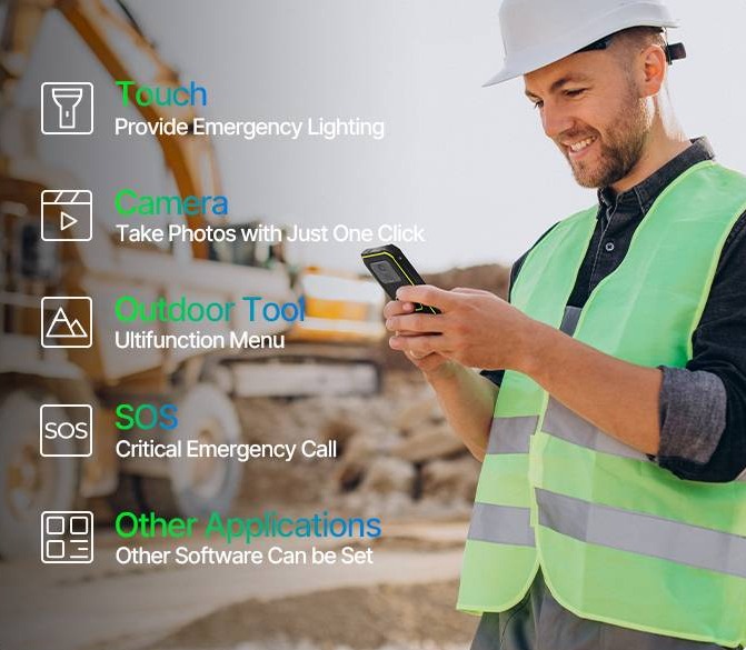 Bluetooth 5.0 syncs with industrial headsets, and customizable keys trigger emergency SOS during critical operations.