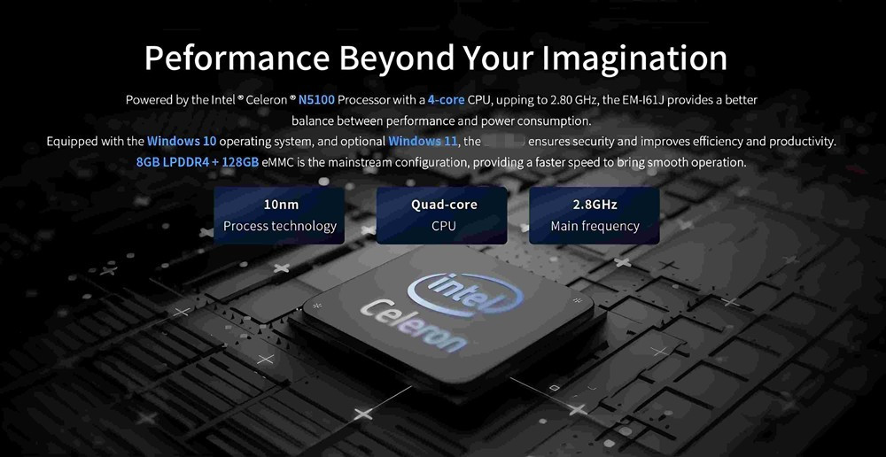Powered by the Intel Celeron N5100 Processor with a 4-core CPU, upping to 2.80 GHzt