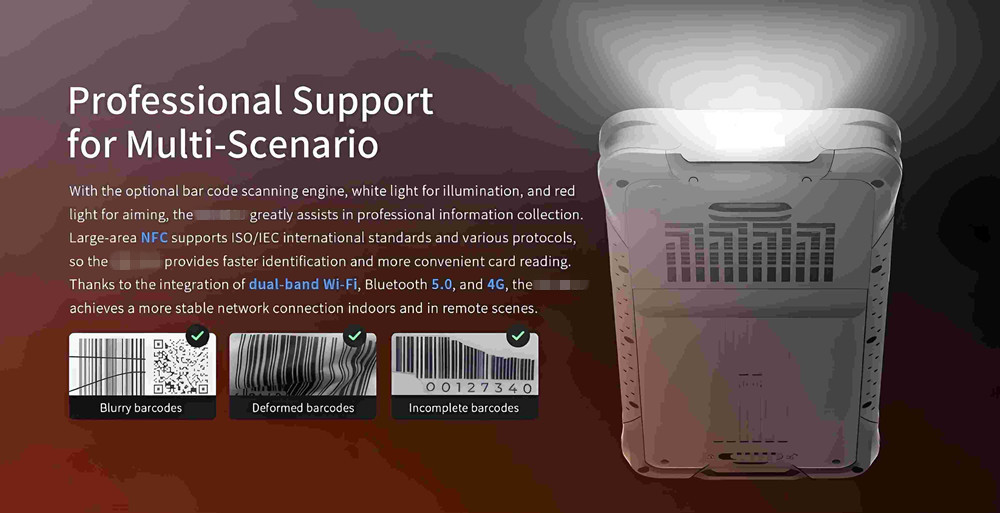 With the optional bar code scanning engine, white light for illumination, and redlight for aiming, this PDA greatly assists in professional information collection.Large-area NFC supports IS0/IEC international standards and various protocols,so the PDA provides faster identification and more convenient card reading.Thanks to the integration of dual-band Wi-Fi, Bluetooth 5.0,and 4G, the PDA achieves a more stable network connection indoors and in remote scenes.