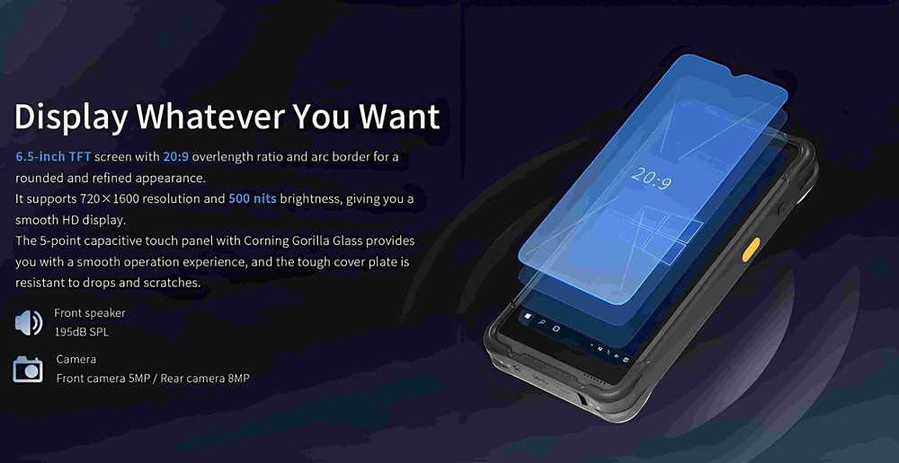| Display | 6.5 inch Corning Gorilla Glass waterdrop IPS capacitive screen, 1600*720px, 500cd/m2 |