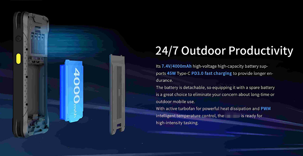 Its 7.4V/4000mAh high-voltage high-capacity battery sup-ports 45W Type-C PD3.0 fast charging to provide longer en-durance.
